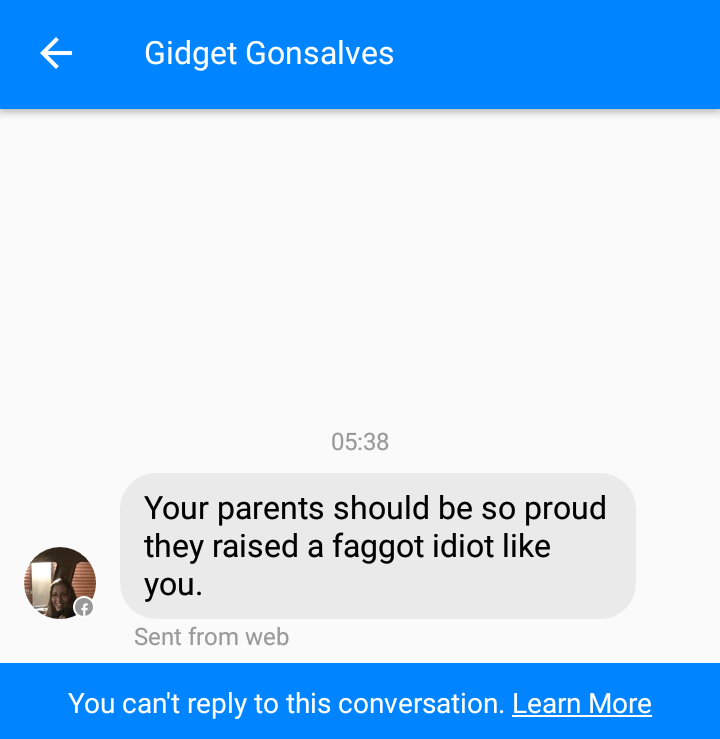 Yeah, Tolerant right? This little gem came a few hours after I said something along the lines of “All gay people aren’t victims and Democrats aren’t our allies.” I was called a “faggot idiot” because I rejected her as an ally and refused to subscribe to her train of thought. In the minds of a Democrat, we are all only allowed to be Gay or Black or Jewish or Asian or anything different as long as we obey them and support their beliefs and not challenge their worldview. If we reject their gracious mercy, we deserve to be attacked and slandered and maligned, and even killed.