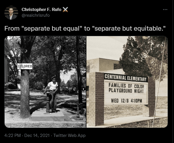 Honestly, I could find no good segue from “educators are acting like pedophiles” back to “they are pushing Jim Crow on our kids”, so I am going to go straight into how certain school districts have been segregating students as an effort to achieve “Diversity”. Last year, on December 17th, 2021, A group called Parents Defending Education filed two separate Civil Rights complaints with the US Department of Education based on two incidents in Illinois and Colorado. The Illinois Complaint revolved around a field trip offered by the Downers Grove South High school which was explicitly labeled as a “Field Trip Opportunity for Students of Color”. The trip was advertised with fliers and in a student announcement which said, “Increasing teacher ‘diversity’ & encouraging young people to pursue education as a career is important. If you are a student of color & you are interested in teaching, then this field trip is for you.” The Colorado complaint was over a “Families of Color Playground Night” arranged by Centennial Elementary’s “Dean of Culture”. Honestly, this whole incident and the reason for the outrage over both incidents are best summed up by this tweet from Christopher F. Rufo which included a picture from the Civil Rights Complaint against Centennial Elementary: